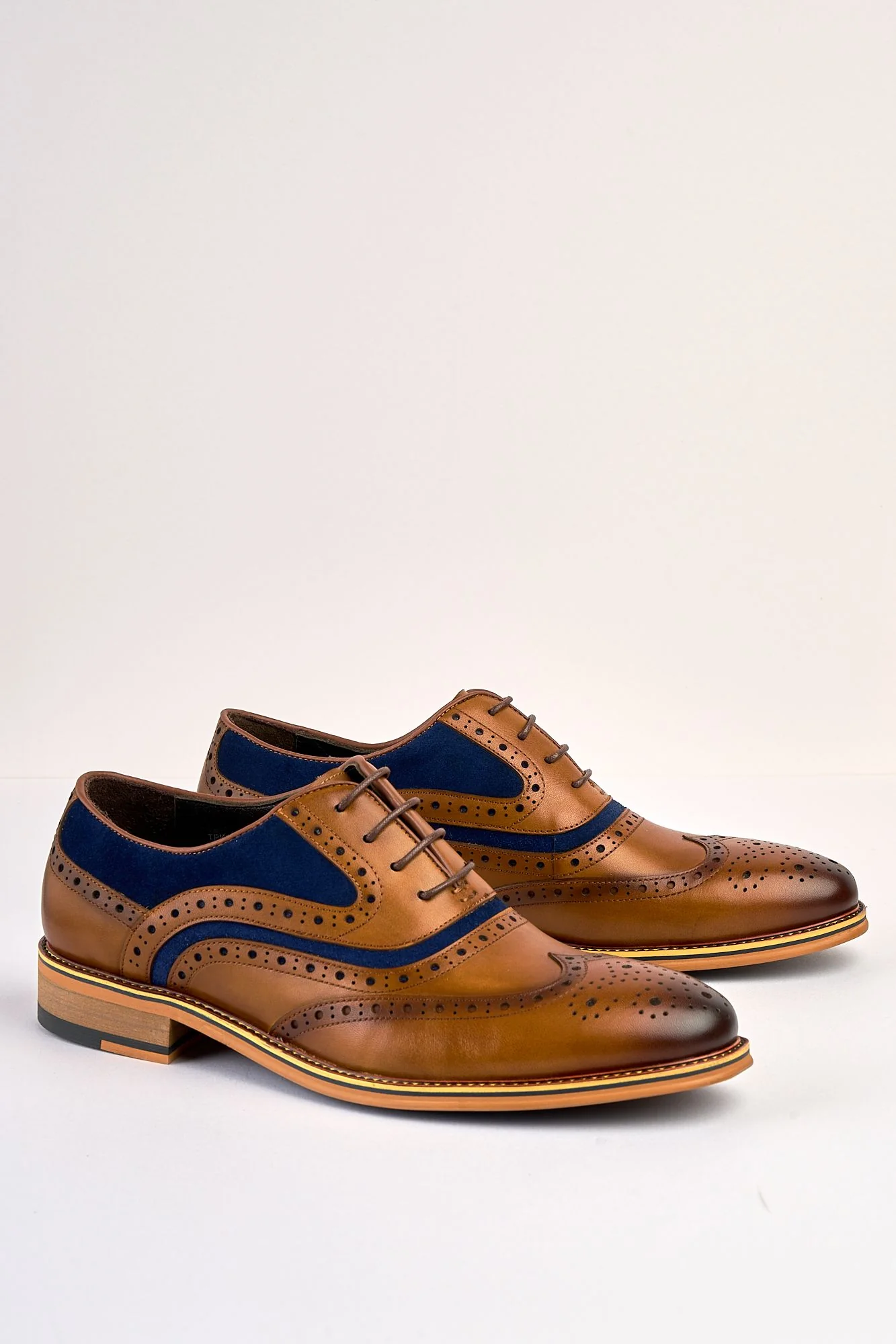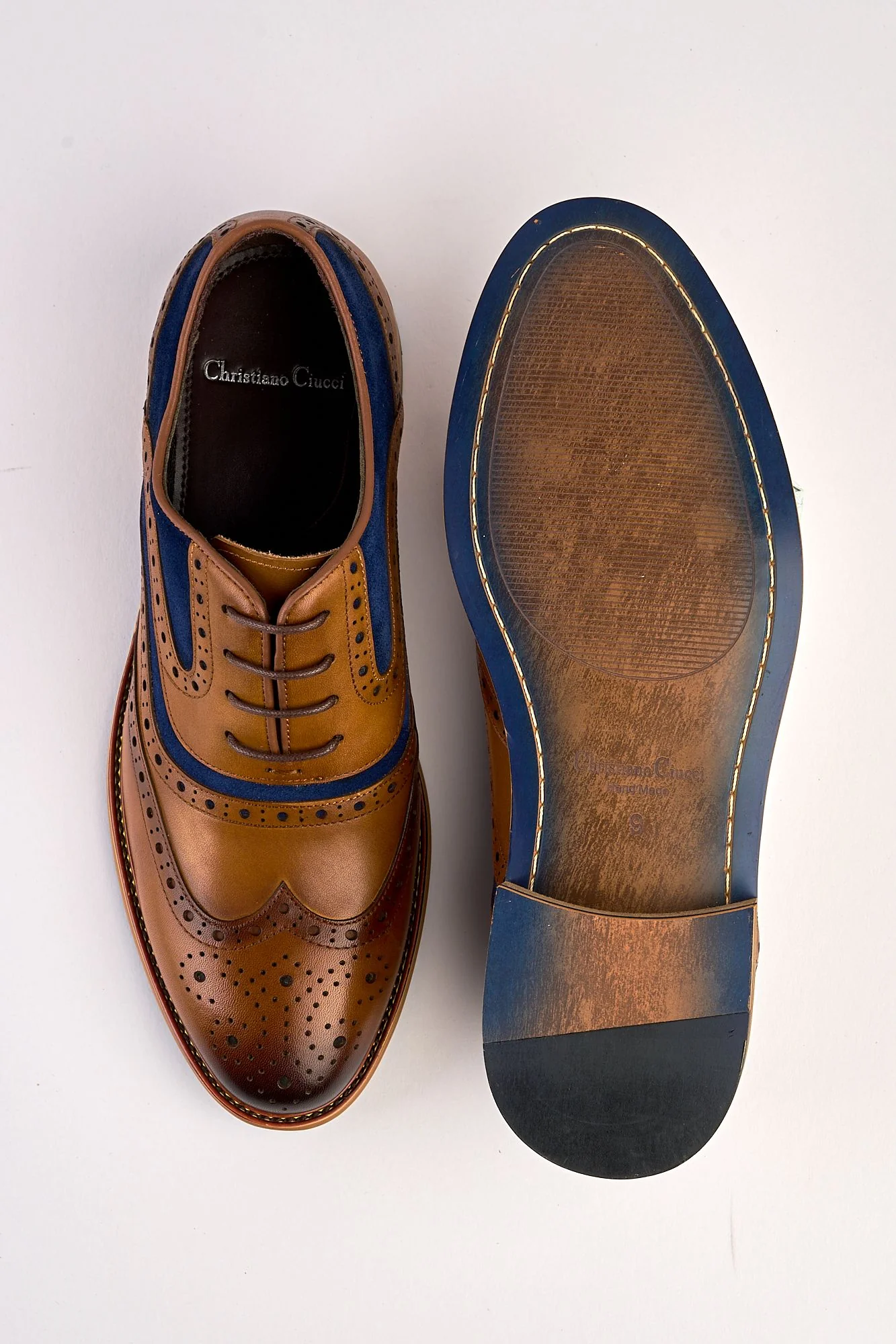 The Antonia Tan/Blue Brogue is where classic craftsmanship meets contemporary daring. Its rich tan leather base is thoughtfully contrasted with deep navy detailing, transforming the traditional brogue into a statement of refined individuality.