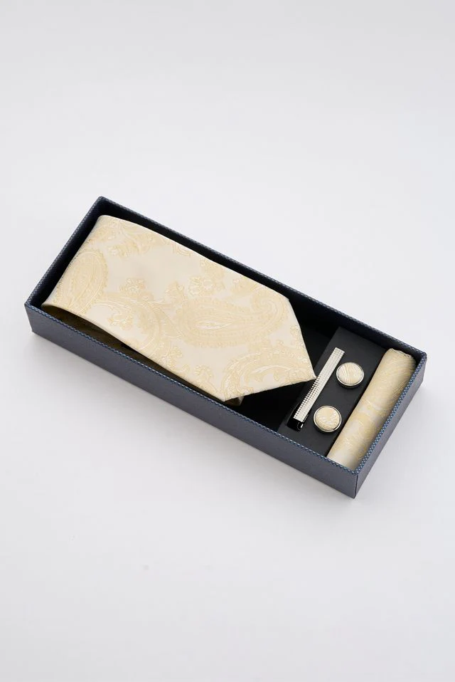 The tie’s rich champagne base is adorned with intricate paisley motifs, adding depth, personality, and a subtle flair to your formal or business attire. Complemented by a matching tie bar and cufflinks, this set ensures every angle of your ensemble speaks refinement.