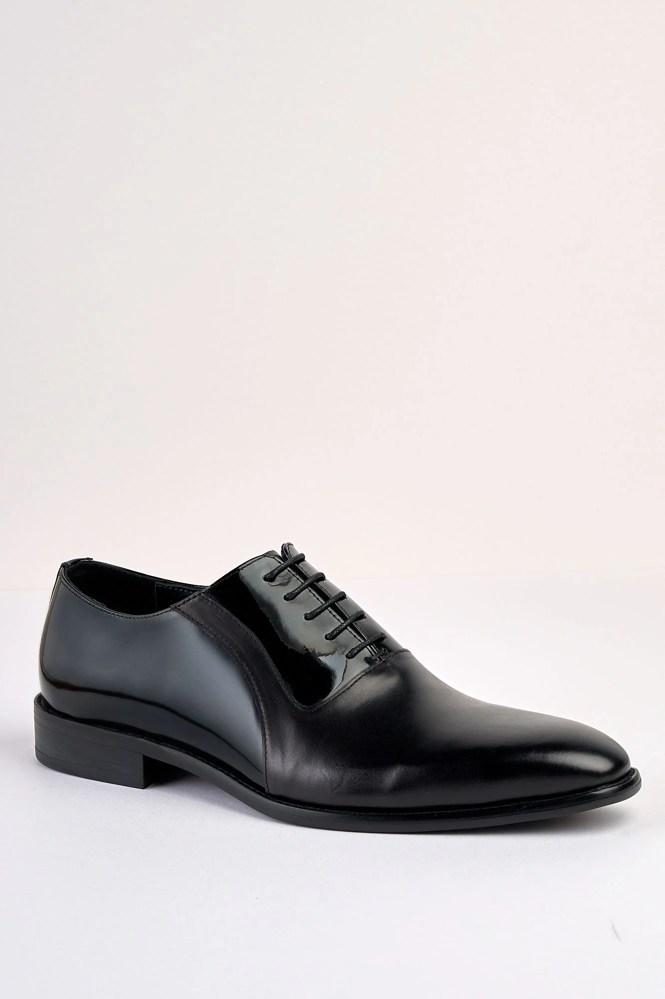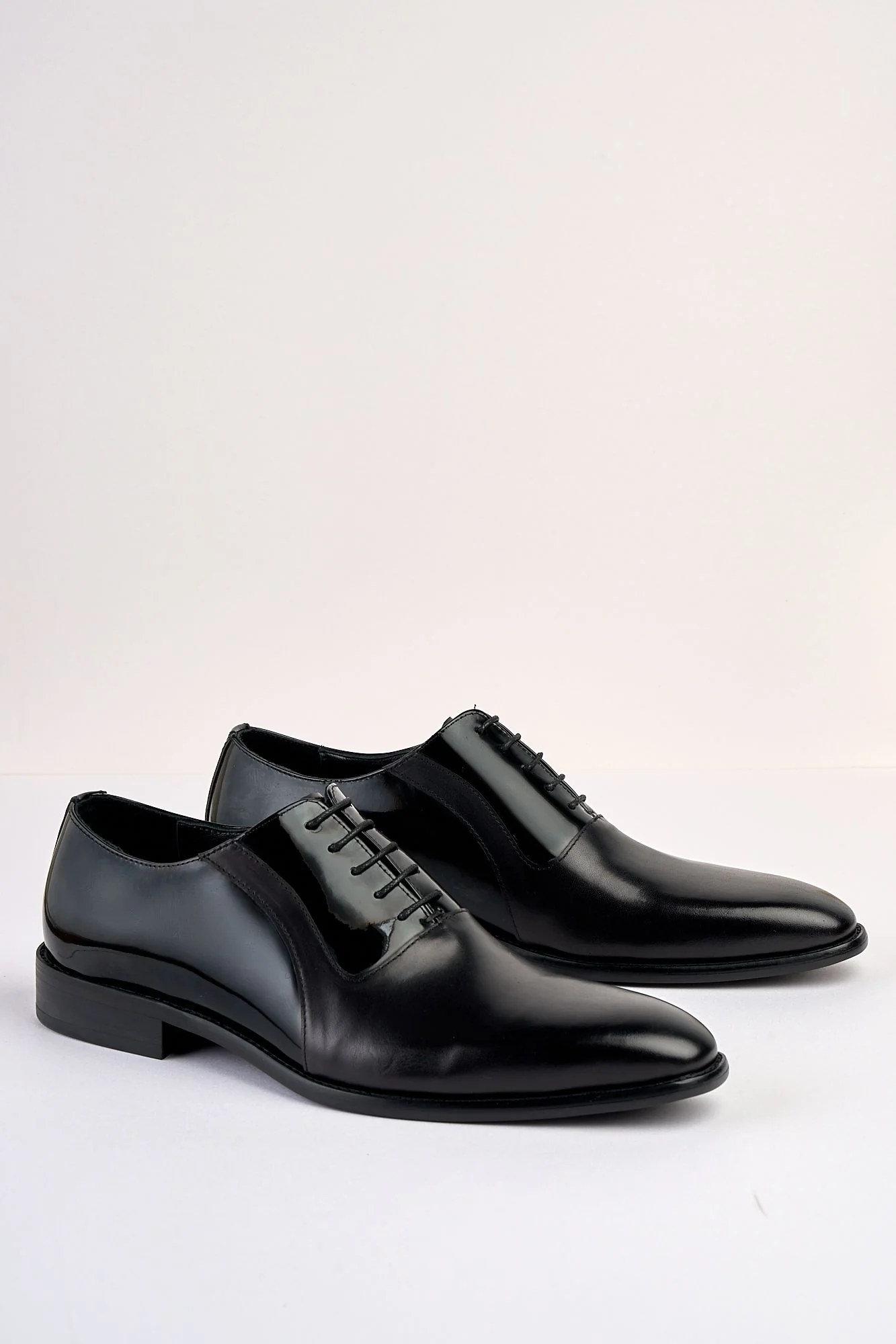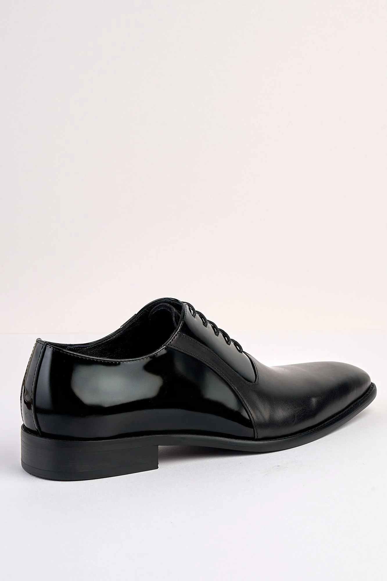 Constructed from premium full-grain leather, the upper showcases a smooth, deep-black finish that complements both sharp tailoring and formal eveningwear. The traditional lace fastening provides a secure, structured fit, maintaining a sleek and polished profile from every angle.