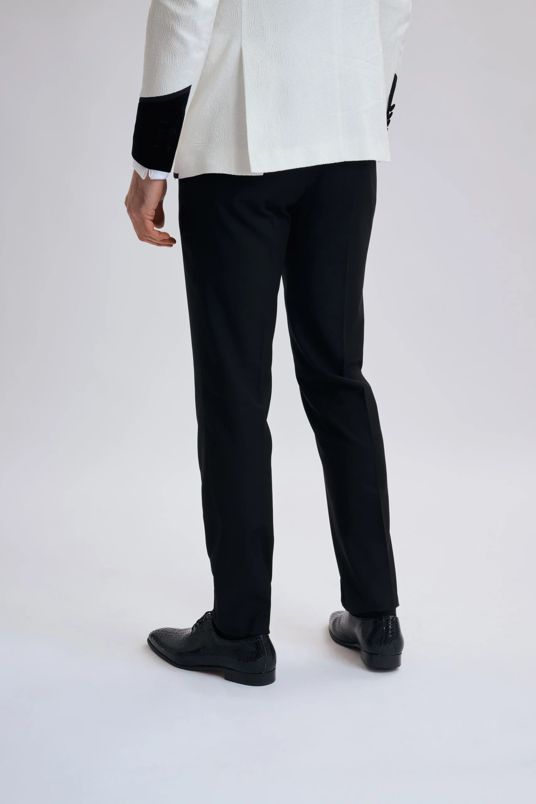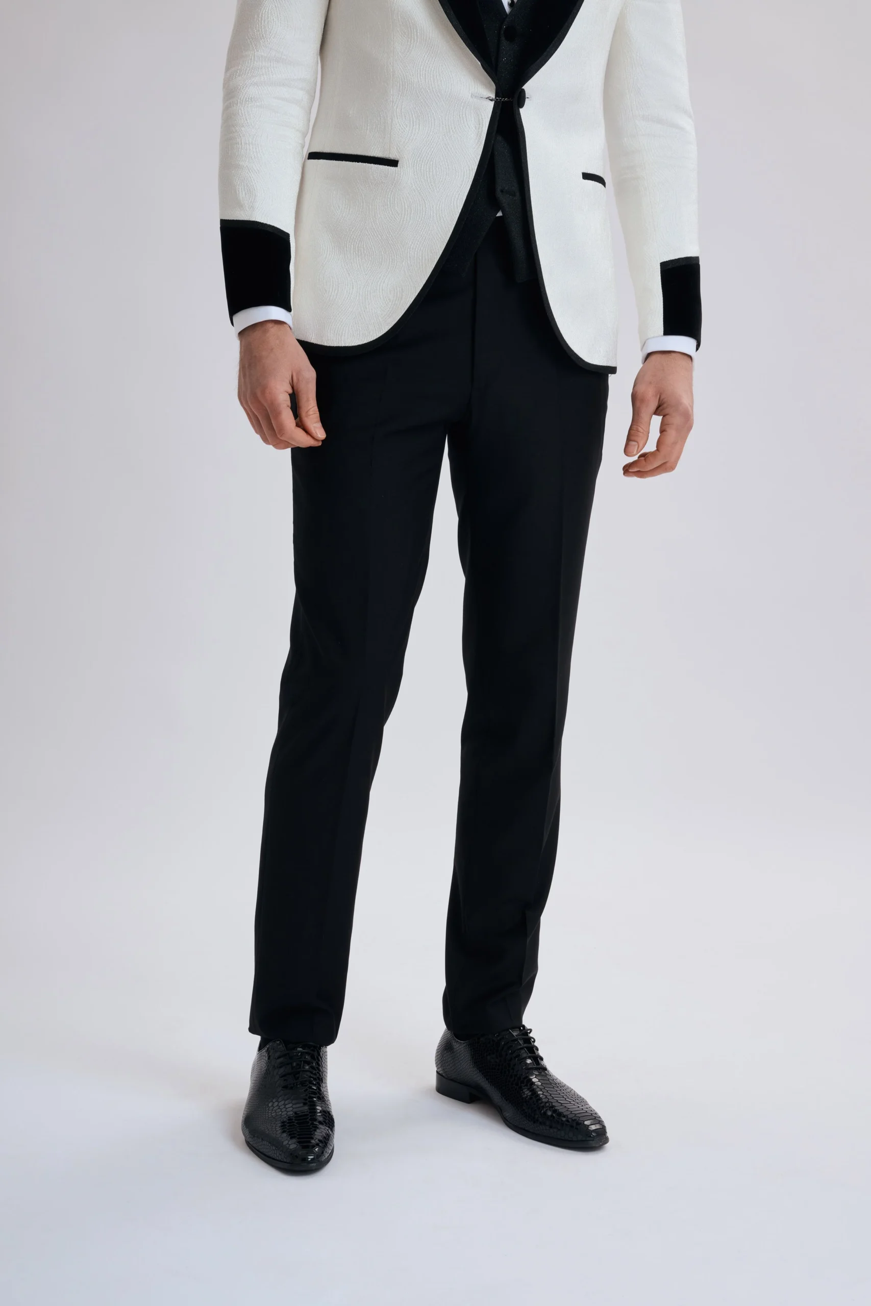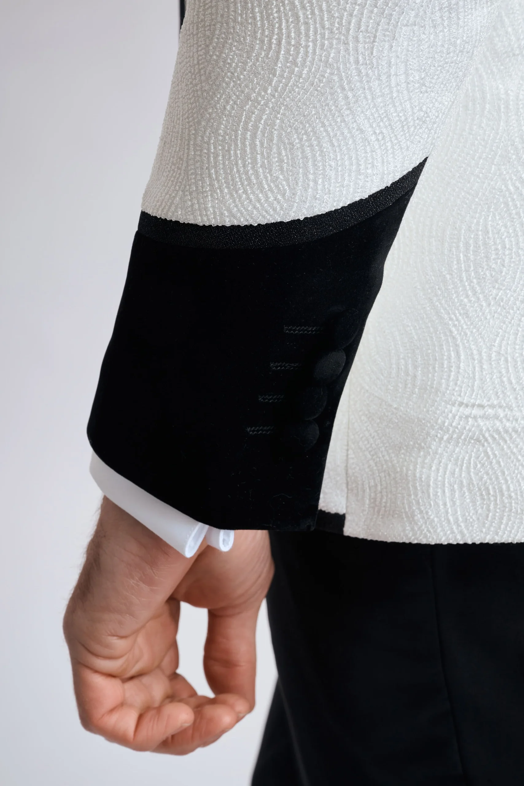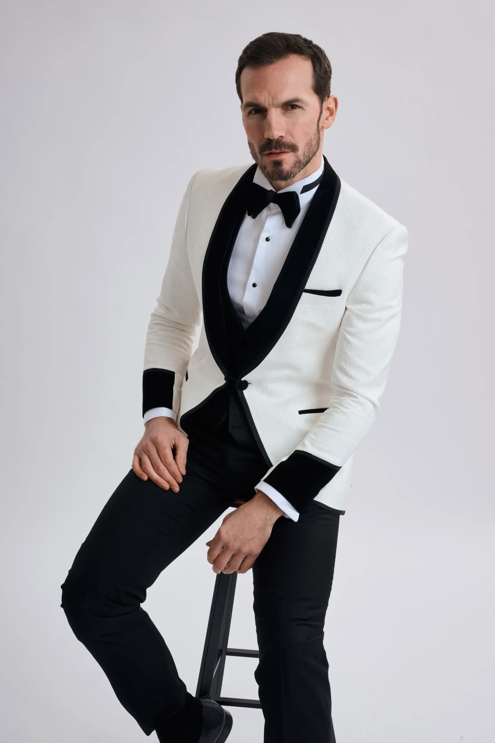 Stand apart with the Verga 3-Piece White Tuxedo by Santoro Milan, a masterpiece of modern elegance and classic sophistication. Expertly crafted for the discerning gentleman, this tuxedo features luxurious textured detailing that adds depth and dimension, elevating every angle of your ensemble.